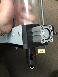 b) Blow air into the hole on the bottom of the mini hopper until drought.